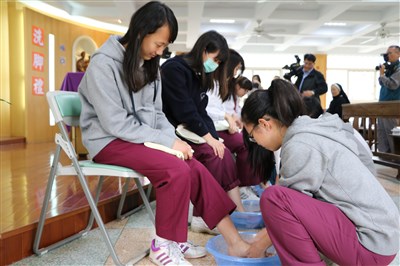 曉明女中17日舉行「洗腳禮」,由師長為學生洗腳,期勉學生透過「洗腳禮」學習謙卑服務的精神。圖/中央社