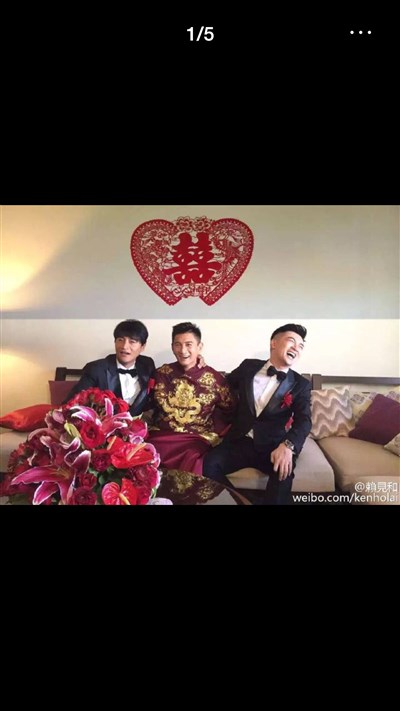 北京稻草熊影視官方微博po出多張照片,吳奇隆上午率領擔任伴郎的小虎隊成員蘇有朋和陳志朋,前往迎接新娘。三人在迎娶新娘時,小虎隊再度合體,又唱又跳成名金曲「青蘋果樂園」,帶動現場氣氛。