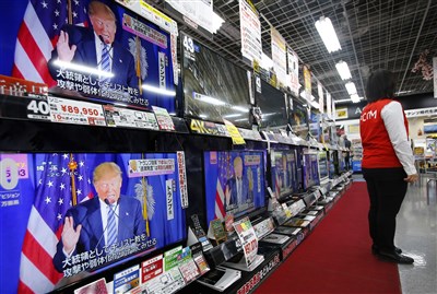 東京一間電器賣場陳列的電視,正在播放川普在「超級星期二」初選勝選感言。圖/美聯社