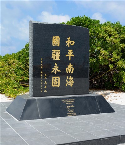 台灣邀請外國媒體23日登上南海太平島參觀,圖為共同社記者拍下的紀念碑照片,紀念碑是去年底設立。圖/共同社