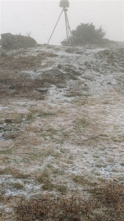 受到強烈大陸冷氣團影響加上水氣充沛,今天上午10時02分玉山氣象站已經觀測到降雪,截至中午為止已經積雪2公分。圖/中央氣象局提供
