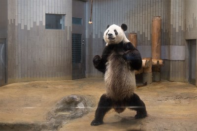 東京上野動物園的「功夫熊貓」其實是一對叫做力力和真真的10歲熊貓,真真為了吃到食物,會做出許多動作,但是牠的功夫還沒有配偶力力來得高明,力力為了吃,什麼奇怪的動作都有,而這些站立的動作是要讓熊貓鍛鍊後腳的力量,不過在攝影師的眼裡,就像是在練功夫。