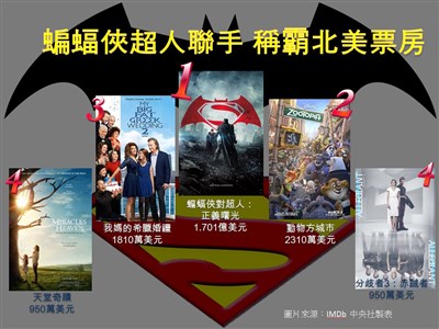 不甩影評一片噓聲,《蝙蝠俠對超人:正義曙光》(Batman v Superman: Dawn of Justice)北美首映交出1.701億美元的佳績。圖/中央社