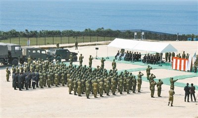 日本自衛隊28日進駐與那國島舉行授旗儀式。圖/路透