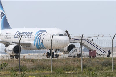 埃及航空公司(EgyptAir)1架客機今天遭劫持轉降賽普勒斯拉納卡機場,劫機犯赫然是位大學教授,據稱他的訴求之一是與在賽普勒斯的前妻會面,當局正送她到機場。圖/美聯社