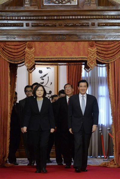 「雙英會」30日上午10時在台北賓館登場,總統馬英九(前右)與總統當選人蔡英文(前左)閉門會談超過1小時後步出會場。圖/中央社