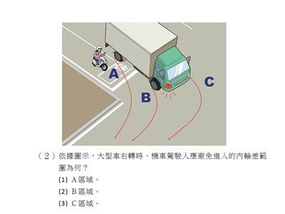 交通部昨天核定公路總局提報的機車考照計畫,今年5月2日起,筆試題庫再增加60題情境式考題,考題包括兩段式左轉、禮讓行人、大車內輪差、機車載運物品與超車等。公路總局監理組長陳聰乾表示,50題筆試考題中會有五題是情境式考題目,圖示述敘可讓民眾更能理解,合格率不會受影響。