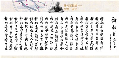 【佛光菜根譚星雲大師一筆字(29)-5】禪似什麼? 六之五 文/星雲大師 |2016.04.01 語音朗讀 1883觀看次 字級 大 中 小 禪,有如山泉清流,它渾然天成,不假造作,它自然而流,不帶勉強。世人皆說流水無情,流水真是無情嗎? 古人卻云:「溪聲盡是廣長舌。」你看,淙淙清泉,山窮水盡處,它百轉千折,卻隨緣安然,任運逍遙;它澄澈見底,而甘純清淨,可以滌人俗慮。 圖/莊美昭 參禪修道的人,永遠活在當下,所謂「逢山開路,遇水搭橋」,事情過去了,心裡面也不必再留有痕跡。 圖/佛光山提供 悟道的人,在悟得那一剎那,真是天崩地裂,山搖地動,不但過去的迷妄粉碎了,自己與宇宙虛空融為一體,現前的更是另有一番新的風光,是另一個真實恆常的世界。 圖/佛光山提供 禪似什麼? 六之五 文/星雲大師 禪似有無超越對待 禪似玄妙難思難測 禪似生命沒有死活 禪似您我但無分別 禪似心空浩瀚無邊 禪似白雲悠遊自在 禪似甘露清涼解渴 禪似冬陽溫暖人心 禪似山嶺難以攀登 禪似飛鳥翱翔自在 禪似燭光一燃即明 禪似流水代佛說法 禪似佛心無可比擬 禪似家人親疏有別 禪似吃飯無人能替 禪似流星ㄧ閃即過 禪似人心變化無窮 禪似多元實際一體 禪似宇宙就是我心 禪似甚麼啥都不是 超越世間 世間諸法,皆為對待之法,因為有對待,因此起種種分別,時而這般,時而那般,因此煩惱、紛爭不已。例如,世間人為了生死,悲喜交替;為了生計,憂悲苦惱;為了貧富,斤斤計較;為了有無,惶惶不安。一天當中,忽悲忽喜,忽苦忽樂,好像熱鍋上的螞蟻,失去了方向。因此,在這個動亂的生活裡,總想有一點解脫自在的生活,有了禪,就能超越對待。如何超越呢?有四點意見: 第一、要視生死一如也:一般人以為生可喜、死可悲,開悟的禪師卻視生死一如,坐脫立亡,來去自如。生死,也是觀念的轉變。過去有位母親想要尋死,老和尚告訴她:「既然你生命不要了,就把它奉獻給佛教吧!」她若有所悟,從此在服務的義工生活裡,獲得歡喜,也獲得重生。生死是什麼?如薪盡火傳、如蟬脫殼,此死彼生,「生未嘗生,死未嘗死」;視生死一如,就能超越限制,超越輪迴。 第二、要視苦樂一味也:中藥裡,甘草味甘,具清熱解毒之效;黃連味苦,亦可解熱去毒,可見甘苦同功也。練功,下苦功夫,才會有所榮耀成就;小丑,內化辛酸,帶給世人歡樂,苦樂亦是同體也。能將苦樂調為一味,認知苦是一種奮鬥、一種增上、一種成果,也就能「處苦境不覺得苦,處樂境也不以為樂」,超越感受,體會中道的生活。 第三、要視貧富一念也:人生的幸福快樂,貧富不是絕對的條件,也不是判定人格尊嚴的標準;有人粗茶淡飯不改其樂,有人富甲一方,仍然憂愁煩惱。如果心裡擁有滿足、歡喜、豁達、緣份、平安,即使身無立錐之地,也可以超越貧富,享有三千大千世界。 第四、要視空有一體也:大部分的人視「空」和「有」為截然不同的境界,「有」的,就不是「空」,「空」的,絕對不可能「有」,用二分法把空、有的關係一刀兩斷。事實上,空、有是一體兩面,好比手心和手背都是肉,又好比孿生兄弟,兩者相需相求、相生相成。如同杯子空了,可以裝水;口袋空了,可以置物。認識空有一體,可以發揮無限。 超越世間,就要超越對待,就要超越分別。所謂:「猶如木人看花鳥,何妨萬物假圍繞?」面對紛擾生活,面對萬花世界,內心不會動搖,這就是超越。如何超越世間?有以上四點意見。 第一、要視生死一如也, 第二、要視苦樂一味也, 第三、要視貧富一念也, 第四、要視空有一體也。 本版文章摘自星雲大師 ──摘自《星雲法語》第一冊 p.67、《禪門語錄》p.7、87、183 前一篇文章 【佛光菜根譚星雲大師一筆字(29)-4】禪似什麼? 六之四 下一篇文章 【佛光菜根譚星雲大師一筆字(29)-6】 禪似什麼? 六之六 熱門新聞 01【遨遊藝事】巴黎 黛瑪兄弟茶館(Dammann Frères)2026.02.0602兩岸新聞營師生 認識人間佛教2026.02.0503極樂寺彩繪燈籠 三好理念廣傳校園2026.02.0404佛教藝文本土化 昆士蘭美術館團隊訪中天寺2026.02.050530冊佛教徒必讀經典 台北書展亮相2026.02.0406南韓城南高中、普中 棒球隊切磋球技2026.02.0407向前有路 光明在望2026.02.0508印尼佛教學院開學 培育國際弘法僧才2026.02.0509社區學童岡山講堂行春 學三好迎接午馬年2026.02.0510立春養生疏肝理氣 飲食調養少酸多甘2026.02.04 訂閱電子報 台北市 天氣預報 台灣一週天氣預報 相關報導 【星雲一筆字古德悟道詩】(55) 【星雲一筆字古德悟道詩】(54) 【星雲一筆字古德悟道詩】(53)【星雲一筆字古德悟道詩】(52)【星雲一筆字古德悟道詩】(51) 【星雲一筆字古德悟道詩】(50) 作者其他文章星雲大師全集【經義】佛法滿人間—和而不流星雲大師全集⑳【佛教管理學③】弘法系列人事篇 人事管理法②星雲大師全集⑳【佛教管理學③】弘法系列人事篇 人事管理法①星雲大師全集【傳記】百年佛緣─社緣篇 國際領袖們的交往片段 4 - 4星雲大師全集【傳記】百年佛緣─社緣篇 國際領袖們的交往片段4-3星雲大師全集【傳記】百年佛緣─社緣篇 國際領袖們的交往片段 4 - 2