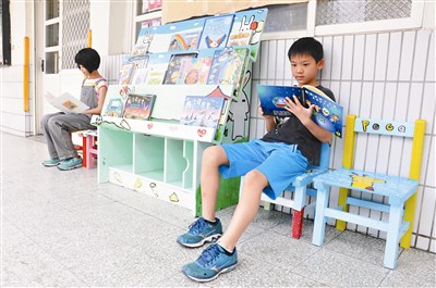 昨天是兒童節,不少家長一早就帶著孩子到校走走,三年級學生陳怡汝興奮跑到「閱讀角」找書,接著抱著書坐在椅子上細細翻閱。她說,很喜歡學校新設的閱讀角,有空就會坐下來看書,感覺特別舒服。