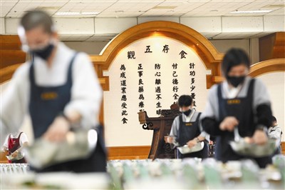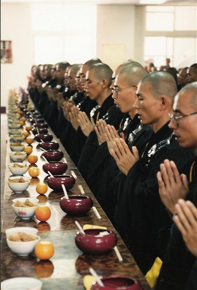 【佛光菜根譚星雲大師一筆字(30)-2】 一的世界 (二) 文/星雲大師 |2016.04.05 語音朗讀 3619觀看次 字級 大 中 小 一次過堂五觀功德。圖/佛光山提供 圖/佛光山提供 圖/佛光山提供 在佛光山,人們彼此見面、打招呼會以蓮花指互道「吉祥」。圖/佛光山提供 一的世界 (二) 文/星雲大師 一眼看透人間萬事 一髮牽動影響全局 一口品嘗美味飄香 一碗飯食來路不易 一次過堂五觀功德 一語開示萬事包容 一言決斷不再疑慮 一理通達萬事明白 一句讚歎皆大歡喜 一聲吉祥彼此互祝 一音讚佛萬千功德 一唱一和默契良好 一曲陽關惜別送行 一片丹心天地可鑑 一石二鳥非常幸運 一點水墨龍鳳呈祥 一竅順暢七竅皆通 一時千載機會難逢 一念三千心包太虛 一心念佛往生淨土 註 1.一次過堂五觀功德 在佛門,上齋堂用餐稱「過堂」,這也是一堂修行功課。所謂「過堂」,就是不能久留,過了就放下了。在心態上,還有所謂的「食存五觀」,即提醒大家在吃飯時應有的正念,是要心存感恩、要知節量、要把飲食當醫藥想,不可有喜惡的分別等。有了正確的飲食觀,不挑食且時時保持歡喜自在的心情,便能擁有健康的身體。 2.一聲吉祥彼此祝福 在佛光山,人們彼此見面、打招呼會以蓮花指互道「吉祥」,有尊重、祝福的意思,同時也希望把「吉祥」推動到普天之下,唯願所有眾生都能吉祥。 食存五觀 我們從事任何事,都應該有一些想法。平時說話,其實也只是為了表達一些觀念、看法;做事,不也是為了要完成一些理念、想法?就連吃飯,也有很多的觀念、想法。佛教把吃飯的地方叫「五觀堂」(齋堂),意即吃飯時,應做「五種觀想」,述說如下: 一、計功多少,量彼來處:吃飯時,須知我今日粒米進口,這是經過農夫辛苦種植,商人販賣,工人處理,家人燒煮,才能填飽我的肚皮,所以粒米的功德,豈是金錢所能衡量?所謂「佛觀一粒米,大如須彌山」,懂得「一粥一飯,當思來處不易」,就能以感恩心受食,進而激發道心。 二、忖己德行,全缺應供:吃飯時應該想一想,自己的道德、貢獻,足以享受這餐美食嗎?如寺院齋堂的對聯說「三心未了水難消,五觀若明金易化」,如此一想,慚愧心油然生起,自然進德。 三、防心離過,不生瞋愛:我們到「五觀堂」的「齋堂」吃飯,叫做「過堂」,這個用詞很有意思,意即告訴吾人,吃飯只是經過齋堂一下,如同「百花叢裡過,片葉不沾身」,不可起貪瞋念頭。在齋堂裡,面對好吃的東西,容易起貪心;不好吃的,則容易生起瞋念,所以必須要慎防自己的道心,要離開過失。 四、正事良藥,為療形枯:吾人所以吃飯,就因為「餓病」發作,所以要以飲食為藥來治療餓病,因此三餐飲食只是為了治病,為什麼要貪求執著呢?三餐飲食既是為求飽腹,讓身體健康,因此不應只在美味上著意。 五、為成道故,方受此食:每日三餐,只是為了維持健康的身體,以便可以修行,成就未來的事業、理念,甚至成道開悟,因此才藉助三餐。進食三餐,既是為成道業,因此應該發道心,要精進奮發,方堪受食。 飲食是人生所不可少的資糧,民以食為天,假如沒有飲食,人就無法生存,因此我們「吃現成飯,當思來處不易;說事後話,唯恐當局者迷」。吃飯應帶著感恩的心,帶著隨緣的念頭,如同佛門的「托鉢乞食」,要次第乞食,平等而乞,要不分貧富,不揀精粗,不計淨穢,不生增減。能夠懷抱這樣的心,才是如法的乞食,才能合乎飲食之道。 ──摘自《人間萬事》第十二冊 p.205 前一篇文章 【佛光菜根譚星雲大師一筆字(30)-1】一的世界(一) 下一篇文章 【佛光菜根譚星雲大師一筆字(30)-3】 一的世界 (三) 熱門新聞 01【遨遊藝事】巴黎 黛瑪兄弟茶館(Dammann Frères)2026.02.0602兩岸新聞營師生 認識人間佛教2026.02.0503極樂寺彩繪燈籠 三好理念廣傳校園2026.02.0404佛教藝文本土化 昆士蘭美術館團隊訪中天寺2026.02.050530冊佛教徒必讀經典 台北書展亮相2026.02.0406向前有路 光明在望2026.02.0507南韓城南高中、普中 棒球隊切磋球技2026.02.0408社區學童岡山講堂行春 學三好迎接午馬年2026.02.0509印尼佛教學院開學 培育國際弘法僧才2026.02.0510立春養生疏肝理氣 飲食調養少酸多甘2026.02.04 訂閱電子報 台北市 天氣預報 台灣一週天氣預報 相關報導 【星雲一筆字古德悟道詩】(55) 【星雲一筆字古德悟道詩】(54) 【星雲一筆字古德悟道詩】(53)【星雲一筆字古德悟道詩】(52)【星雲一筆字古德悟道詩】(51) 【星雲一筆字古德悟道詩】(50) 作者其他文章星雲大師全集【經義】佛法滿人間—和而不流星雲大師全集⑳【佛教管理學③】弘法系列人事篇 人事管理法②星雲大師全集⑳【佛教管理學③】弘法系列人事篇 人事管理法①星雲大師全集【傳記】百年佛緣─社緣篇 國際領袖們的交往片段 4 - 4星雲大師全集【傳記】百年佛緣─社緣篇 國際領袖們的交往片段4-3星雲大師全集【傳記】百年佛緣─社緣篇 國際領袖們的交往片段 4 - 2