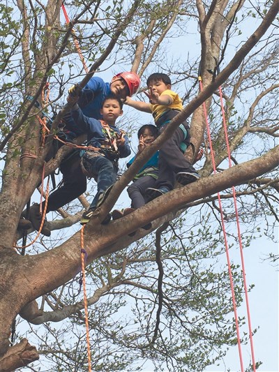 林義成老師(左圖)教導學生利用繩索爬樹,讓他們感受「向上」的力量。