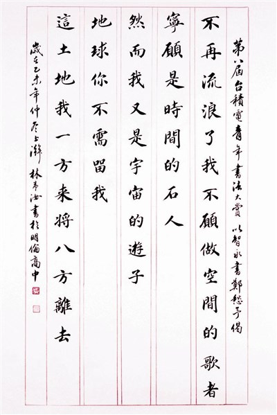 第八屆台積電青年書法篆刻大賞 |2016.04.08 語音朗讀 1177觀看次 字級 大 中 小 行草組貳獎──王若禧/台北市士林區台北美國學校 楷隸組貳獎──林韋汝/台北市文山區景美女中 得獎作品展 3.12~4.13 中正紀念堂 三樓采玉藝廊 前一篇文章 老夫子成語教室 封侯萬里 下一篇文章 編按 熱門新聞 01台中新社花海 重現經典卡通2025.11.0602WTA、ATP年終賽 獎金創新高2025.11.0703佛光佈教師、友愛服務隊 精進行佛2025.11.0604《365日》贈嘉義香湖國際大飯店 佛光人結書香善緣2025.11.0605【生活快門】 喜見採茶女2025.11.0606水星室內樂團表演 中美寺傳遞愛與和平2025.11.0607日中文化藝術季 大阪佛光合唱團獻唱2025.11.0608【牽手一生】 最深的愛是 我陪你2025.11.0609健保補充保費變革 政院急踩煞車2025.11.0710再闖WTA年終賽 謝淑薇力拚第2冠2025.11.07 訂閱電子報 台北市 天氣預報 台灣一週天氣預報 相關報導 【時事必考題】變個魔術 【名人故事館】 戰國時代的韓非(上)【青春部落】 勇氣的顏色【時事必考題】不是惡搞【翰墨清韻】【無所不知】艾菲爾鐵塔(下) 作者其他文章困境中從容轉身莫迪會見普亭 盼俄烏戰爭盡快落幕面對災厄無常 善念可化解與修復天然營養時蔬料理當義工 可延緩老化創意處方箋 滋養心靈活力倍增