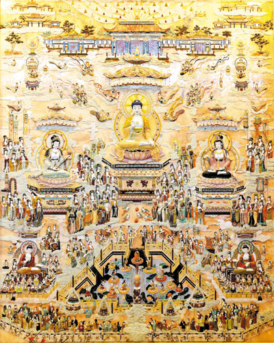 據《阿彌陀經》描述,阿彌陀佛是西方極樂淨土的教主,這裡的居民為「諸上善人聚會一處」,他們注重品德,相互尊重,每日清晨都要拿著香花到十方佛國供養。人與人之間若能秉持這樣的平等心量,互助互愛,當下即是人間淨土,何需再去找尋另一個淨土呢?圖為佛光祖庭大覺寺大雄寶殿內之玉雕經變圖「西方淨土」。