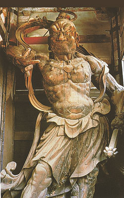 「一刀三禮」是佛教用語。即信仰虔誠者,在雕造佛像時,為了表示虔誠恭敬,每刻一刀即禮拜三次。圖為日本東大寺南大門的金剛力士。