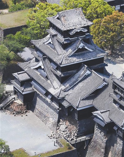被列為日本3大古城之一的熊本城不只城牆倒塌,連屋頂瓦礫也被震裂。圖/法新社