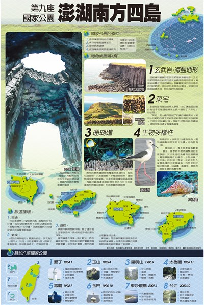 位於澎湖南方海域的南方四島,由東嶼坪嶼、西嶼坪嶼、東吉嶼、西吉嶼及周邊數個天然島嶼組成,因地理優勢孕育多樣性海洋生物及珍貴珊瑚礁群,特殊的玄武岩地質地形、海蝕景觀,並保有梯田式「菜宅」等獨特人文地景,於103年6月公告成為台灣第九座國家公園。