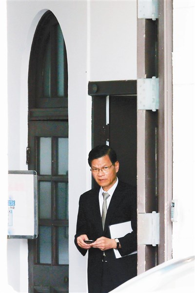 中研院長翁啟惠昨天進總統府向馬英九總統報告浩鼎案,在府內待了一個小時後離開,要離去前因車輛未即時到,讓他在側門稍候了一會。圖/王騰毅
