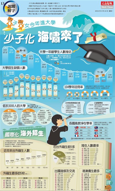 子女今年進大學 少子化海嘯來了 |2016.05.16 語音朗讀 2315觀看次 字級 大 中 小 子女今年進大學 少子化海嘯來了 少子化對台灣高教的衝擊,第一波海嘯今年要來了! 民國87年虎年出生的人口比前一年龍年少了5萬人左右,虎子虎女們今明兩年要進大學,故今年也有台灣高教「105年大限」之稱。雖然教育部尚不公布各大學註冊率及退場、轉型輔導名單,但仍可看出蛛絲馬跡,哪些大學在「淹水線」之下?考生選校系如何避免踩到地雷校系? 前一篇文章 流通業30年 柑仔店大變身 下一篇文章 都市裡種菜 原來這麼簡單 熱門新聞 01【詩】草螟公2025.12.1802【閃文集】火星暗斑之謎2025.12.1603【為人父母】 允許如其所是2025.12.1504【詩】 航夢2025.12.1505東方微笑跨越千年 麥積山石窟現佛館2025.12.1506福建艦航經台海 空拍照首曝光2025.12.1807高雄新航線明啟動 佛光山成亮點2025.12.1708如何優雅不濺水花?2025.12.1609寶塔寺 三代同堂搓湯圓、繪燈籠2025.12.1610佛光山福國寺 獲頒台南市宗教績優團體獎2025.12.15 訂閱電子報 台北市 天氣預報 台灣一週天氣預報 相關報導 大學校名怎麼來? 作者其他文章優化大腦 自我實現心理投射現象解析從潮流到商機 流行文化吸引力困境中從容轉身莫迪會見普亭 盼俄烏戰爭盡快落幕面對災厄無常 善念可化解與修復