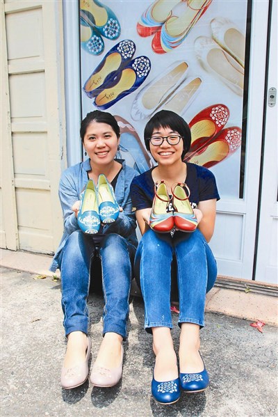 江珮嘉(左)二○一三年創立繡花鞋品牌「hsiu」,希望客人能穿著台南記憶走出世界。圖/曹馥年
