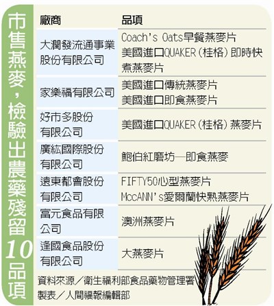 市售燕麥,檢驗出農藥殘留10品項 資料來源/衛生福利部食品藥物管理署 製表/人間福報編輯部