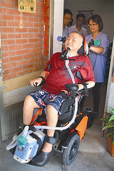【本報彰化訊】彰化縣溪湖鎮四十七歲的楊宏毅,十四年前擔任聯結車司機,搬運貨物時摔傷,頭部以下全身癱瘓,依賴呼吸器維生,他曾失望的要妻子拔掉呼吸器,妻子說「那我要一起走」,從此他不敢再說喪氣話,弘道老人基金會發起「輪旋二部曲」計畫,捐贈特殊功能電動輪椅,讓楊宏毅靠下巴操控輪椅,走出戶外。