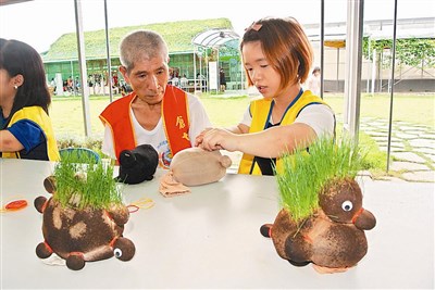 罹患侏儒症的「小小人」吳佳晏(右),與長者一起DIY製作麥草園藝。