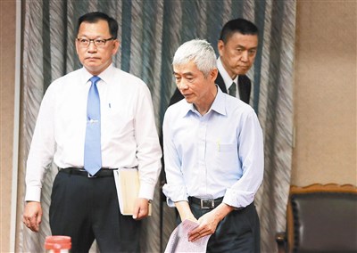 交通部長賀陳旦(前)昨天到立法院報告桃園機場二日淹水檢討。報告前,賀陳旦在發言台上鞠躬向社會致歉。桃機董事長林鵬良(後左)、總經理費鴻鈞(後右)也應邀備詢。圖/中央社