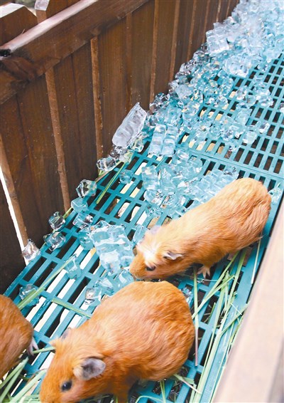 彰化市今夜星辰休閒農場園區內的天竺鼠與兔子為躲太陽,常待在室內不願到戶外「見客」,員工只好將大大小小冰塊倒在室外跑道,並以冰鎮過的蔬果吸引牠們,施聯邦說,天氣熱要多提供草食,以確保動物體內水分充足。