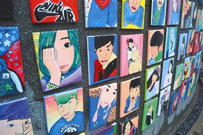 校方在活動中心外牆展出兩百幅畢業生自畫像,簡單的線條及鮮明的色彩,傳達出每個人背後的故事與獨特性。圖/曾健祐