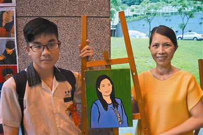 校長辜雅珍(右)的兒子范淯(左),也是應屆畢業生,他除了畫自己,還替媽媽的畫像上色,令辜雅珍感到驚喜萬分。