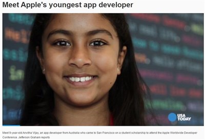 「今日美國報」(USA Today)報導,來自墨爾本(Melbourne)的維傑開發出1款適用iPad和iPhone的應用程式,名為「Smartkins Animals」,並透過申請蘋果獎學金專案參加WWDC。