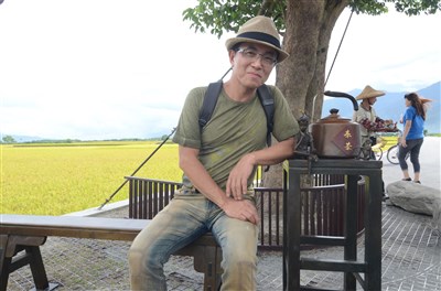 【本報台東訊】台東池上金城武樹旁的裝置藝術,推出進化版,原來大理石雕做的水壺,今天換成銅雕,更接近鄉土味。
