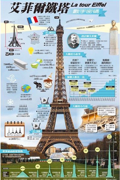 艾菲爾鐵塔 La tour Eiffel 數字密碼 國際組 |2016.06.27 語音朗讀 1722觀看次 字級 大 中 小 艾菲爾鐵塔 La tour Eiffel 數字密碼 文字:國際組 2016歐洲足球賽10日在法國巴黎開踢,首場比賽為地主法國對戰羅馬尼亞。巴黎的球迷專區是10個城市中占地最廣的一個,位於艾菲爾鐵塔下的戰神廣場(Champ de Mars),供數萬球迷入場觀看賽事轉播。在鐵塔開放滿27周年之際,我們特別推出艾菲爾鐵塔專題報導,使讀者能夠更深入了解並親近它。 前一篇文章 小心動物 拒絕路殺 下一篇文章 8月來瘋里約奧運 熱門新聞 01【詩】草螟公2025.12.1802【閃文集】火星暗斑之謎2025.12.1603【為人父母】 允許如其所是2025.12.1504【詩】 航夢2025.12.1505東方微笑跨越千年 麥積山石窟現佛館2025.12.1506福建艦航經台海 空拍照首曝光2025.12.1807高雄新航線明啟動 佛光山成亮點2025.12.1708如何優雅不濺水花?2025.12.1609佛光山福國寺 獲頒台南市宗教績優團體獎2025.12.1510寶塔寺 三代同堂搓湯圓、繪燈籠2025.12.16 訂閱電子報 台北市 天氣預報 台灣一週天氣預報 相關報導 大學校名怎麼來?