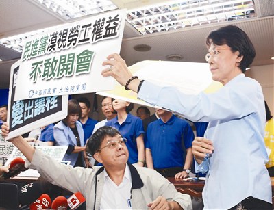 王育敏表示,變更議程討論的是重大的勞工議題,勞團都已到行政院抗議,民進黨團還護航,不敢討論勞工議題,要予以最嚴厲的譴責。