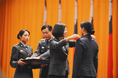 蔡英文總統昨天到高雄陸軍官校出席「三軍五校院聯合畢業典禮」,圖為蔡總統在畢業典禮上為畢業生授階。圖/中央社