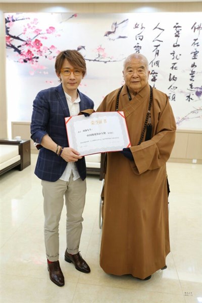 星雲大師頒贈「中國麋鹿保護大使」證書予國際魔術師劉謙(左)。圖/人間社記者慧延