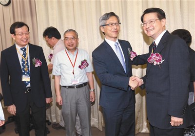 中研院第三十一屆院士名單揭曉,共有二十人獲選,圖為院長廖俊智(右二)歡迎新科院士吳玉山(右)、黃正德(左一)、鄭清水(左三)。圖/中央社