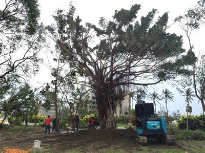 林試所說明,人員機具已連夜趕赴台東,從今早9時就開始救援工作,11時已初步完成第1棵80年生老榕樹搶救工作。
