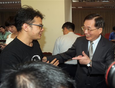 立法院社福及衛環委員會邀請勞動部長郭芳煜(右),就「一例一休」做專題報告並備詢,郭芳煜在休息時間向出席的勞團工會代表握手致意。圖/中央社