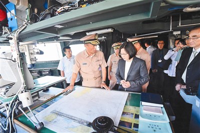 【記者陳忠賢台北報導】南海仲裁結果出爐,太平島被判定為「礁」,舉國嘩然!為捍衛太平島主權,政府改派海軍康定級迪化艦,提升南海巡弋任務層級,原訂十四日出航,昨天提前出航,總統蔡英文特別登艦對官兵精神講話。立法院內政委員會也通過臨時提案,建請蔡英文總統登太平島宣示主權,總統府表示,不排除。
