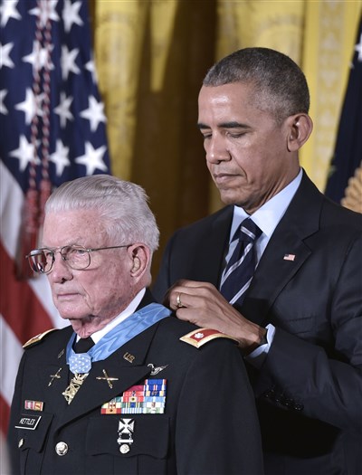 歐巴馬將美國最高軍事榮譽,授予退休越戰直升機駕駛—凱特斯。圖/法新社