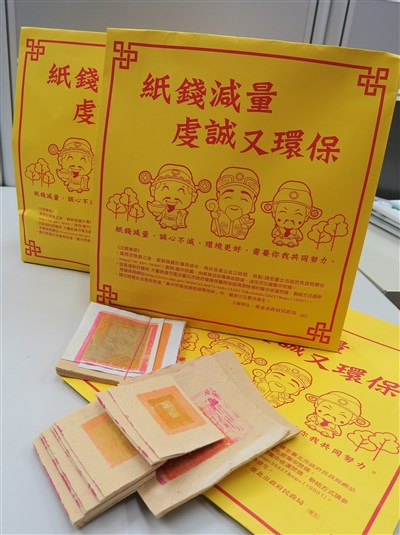 因應中元普度,北市府推出紙錢集中焚燒服務,免費提供10萬個「紙錢專用袋」。圖/中央社