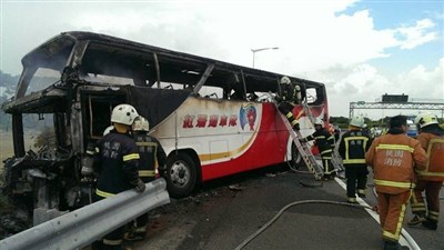 遼寧旅遊團火燒車事故,日前查出駕駛艙有2瓶、下層行李層有3瓶「汽油」,前門口被燒熔的地毯也有汽油殘留跡象。