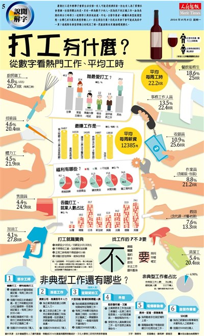 暑期打工是年輕學子重要生活安排,有人可能是經濟因素,但也有人為了累積社會歷練。但值得關注的是,另有一群為數不少的人,因為找不到正職工作,淪為長期的部分工時勞工;這類勞工與其他派遣、外包、自營作業者,都屬非典型就業型態。台灣已有78萬非典型勞動人口,存在那些行業?