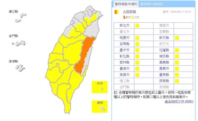 豪雨特報!下班放學記得帶雨具 |2016.08.17 語音朗讀 1041觀看次 字級 大 中 小 中央氣象局發布豪雨特報。圖/氣象局提供 【本報台北訊】中央氣象局發布豪雨特報,受熱帶性低氣壓外圍雲系及午後對流雲系發展旺盛影響,易有短時強降雨,今日花蓮山區有局部豪雨,台中以南地區、新北至苗栗山區及台東地區有局部大雨發生的機率,請注意雷擊、強陣風,低窪處慎防積水,用路行車注意交通安全。 前一篇文章 父母亡男童砍竹筍賺學費 臉書回響 下一篇文章 試膽極限 張家界玻璃橋20日運行 熱門新聞 01華府櫻花綻放 吸引遊客2026.03.2802長照3.0增「互助喘息」 用服務換照顧2026.03.2803穩定物價 4月起電價凍漲 2026.03.2804雲林最炫兒童節 孩童搭乘熱氣球2026.03.2805宜蘭至羅東鐵路高架化 消除9平交道4陸橋2026.03.2806能源漲價 央行逐季檢視通膨2026.03.2807佛光山月光寺啟用 花蓮心靈新地標2026.03.2908推動科學辦案 鑑識權威李昌鈺87歲辭世2026.03.2909俄烏戰燒錢 普亭向俄富豪募款 2026.03.2810塞內加爾紀念碑 闡述販奴黑歷史2026.03.28 訂閱電子報 台北市 天氣預報 台灣一週天氣預報 相關報導 【星雲大師如是說】處事禪心【星雲大師如是說】人間佛教【星雲大師如是說】正信之美【星雲大師如是說】輪轉相繼【星雲大師如是說】有情的層次【星雲大師如是說】六忍歌