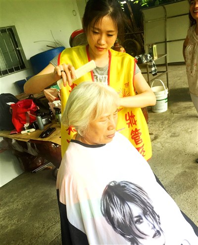 城市科大妝管系大四生徐聖玲擔任李素美的小幫手,有一次替臥床15年的阿嬤剪髮,阿嬤平時活動地方只在單人床上,生活必需品都堆在床上,一開始看到師生入門有點困窘,後來在村長和約瑟糧倉慈善協會協助溝通下,師生兩人在阿嬤的床上剪出超短的俐落髮型,方便她日後好整理。