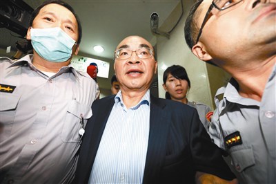 台北地檢署偵辦兆豐案,昨天以證人身分傳喚兆豐金前董座蔡友才(圖中)到案說明,經過四個小時的訊問後,檢方諭令限制出境、出海及小三通,並轉列偵字案被告。