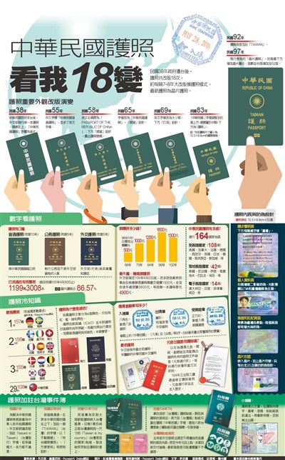民國38年政府遷台後,護照共改版18次,約每隔7~8年大改版換護照樣式。最新護照為晶片護照。