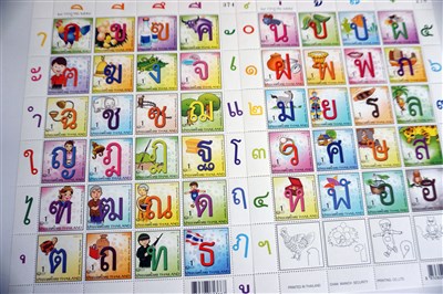政府推動新南向政策,有不少人學習東南亞語言,其中北東協中應用最廣的就屬泰語,學習泰語一定從字母認識起,泰國郵政總局也發行一套字母郵票,將泰文的44個子音和32個母音基本寫法,以及從0到9的寫法,都印在一張小全張上。