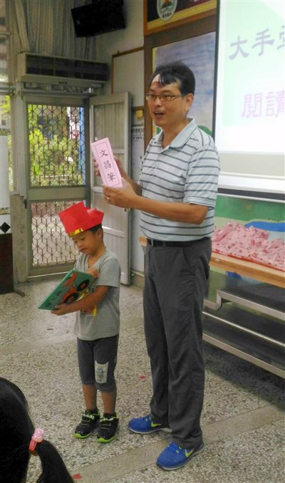 開學日,台東電光國小僅有1名新生 (左),校長姚乃仁(右)為他戴上狀元帽。圖/中央社